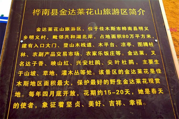 人间四月芳菲尽、桦南五月山花开。桦南县映山红花山旅游区位于明义乡明义村东明屯,距201国道6公里,是佳木斯地区面积最大、保护最好的野生映山红观赏区。景区占地面积21万平方米,建设登山木栈道、图腾柱林、农副产品交易市场、农家乐饭庄等。映山红,又名兴安杜鹃、达子香、满山红,是我国三大天然名花之一,被誉为“花中西施”, 映山红是北国报春之花,五一前后,叶未绿、花先发,花蕾和怒放的鲜花交相辉映、艳丽夺目,清香淡雅、沁人心脾,灿似彩霞、满山红透,叠锦堆秀、蔚为壮观。