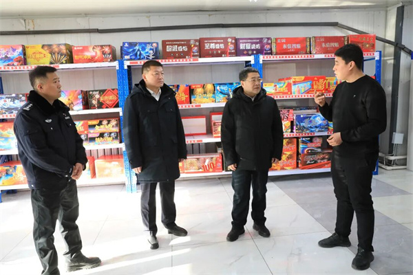 在烟花爆竹第一门市部,程显峰仔细查看烟花爆竹种类、存量及存放条件,询问了解进货渠道、质量管控、市场销售等情况。他强调,各销售点必须依法合规经营,坚持从正规渠道进货,严格管控质量和库存量,加强对消费者的安全宣传教育,确保烟花爆竹经营规范、燃放安全。