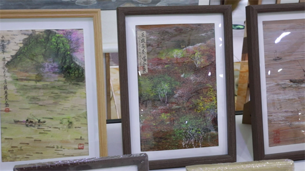 作为非物质遗产项目的桦树皮自然纹理画备受瞩目,传承人魏师傅以白桦树皮为原料,经多道工序处理后,运用剪、刻、烫等技法创作《六出飞花》《波映五花》《春江水暖》等作品,将树皮天然的米白、淡黄及褐色纹理化为山川的脉络、河流的蜿蜒,树皮纹理与匠心技法交融,尽显北方民族的自然情怀与古朴审美,让观众直观领略非遗技艺的精妙。