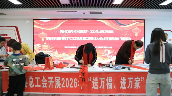 活动现场,红纸铺展,翰墨飘香,受邀而来的书法老师凝神聚气,挥毫泼墨,笔锋流转间,一副副寓意吉祥、充满祝福的春联和一个个饱满有力的“福”字跃然纸上,承载着对新一年的美好祈愿,围观的群众一边欣赏精湛的书法,一边挑选心仪的联句,喜悦之情溢于言表。