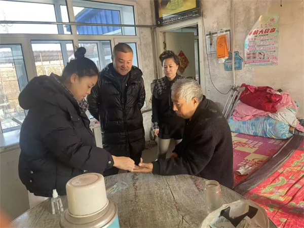 活动现场,医师团队有序为村民提供血压测量、血糖检测、心脑血管疾病筛查等多项健康检查服务。医师们耐心细致地询问每位村民的身体状况、既往病史和用药情况,对检查中发现的潜在健康问题逐一进行讲解,给出个性化的诊疗建议和日常保健指导,提醒大家冬季注意防寒保暖、合理饮食、适度锻炼,养成良好的生活习惯。活动期间,不仅为村民提供了专业的健康诊疗服务,还向大家普及了实用的冬季健康防护知识,为100多名村民提供了免费体检服务,发放了50余件包含口罩、纱布、膏药等常用药品医用礼包,切实解决村民日常应急需求。