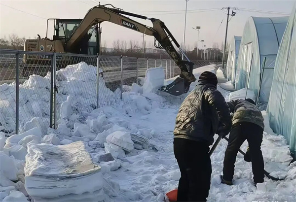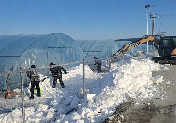 清雪现场,一派热火朝天的忙碌景象。大家分工协作,有的手持扫帚、铁锹细致清扫积雪,小心翼翼避开棚膜,避免因操作不当造成损失,有的排查棚体结构,及时加固松动支架。铲车轰鸣作业,高效清理棚外堆积积雪,做到“人工清雪保安全、机械清雪提效率”。