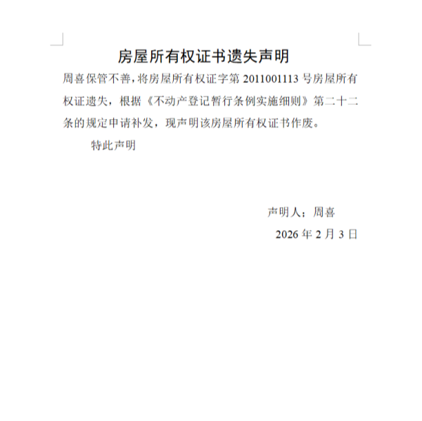 周喜房屋所有权证书遗失声明