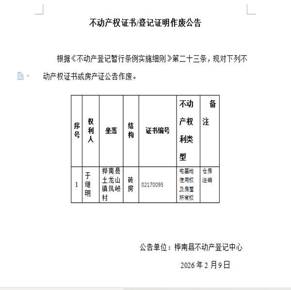 不动产权证书/登记证明作废公告(于继明)