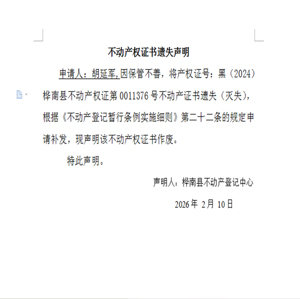 不动产权证书遗失声明(胡延军)