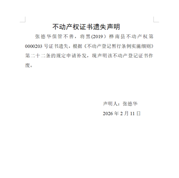 张德华不动产权证书遗失声明