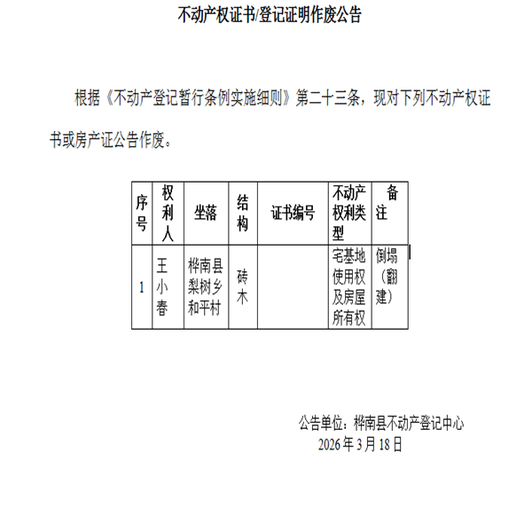 不动产权证书/登记证明作废公告(王小春)