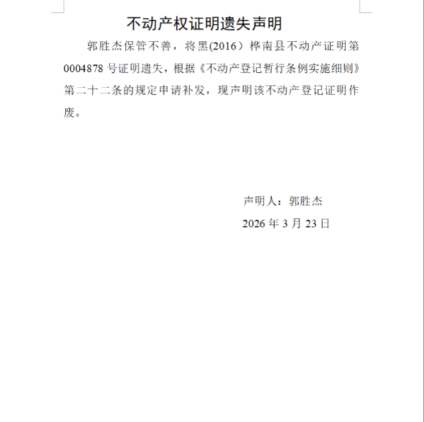 郭胜杰不动产权证明遗失声明