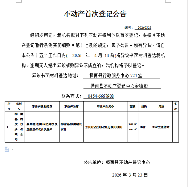 不动产首次登记公告(桦南县喜庆日杂有限公司)