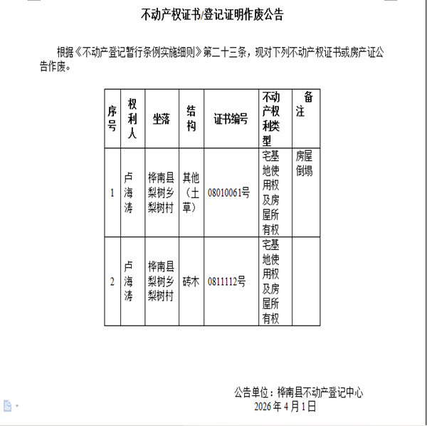 不动产权证书/登记证明作废公告(卢海涛)