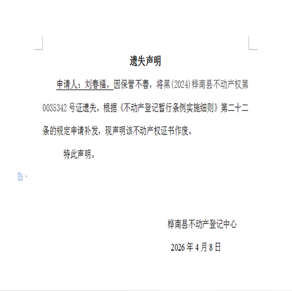 不动产权证书遗失声明(刘春福)