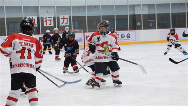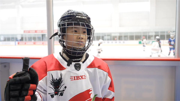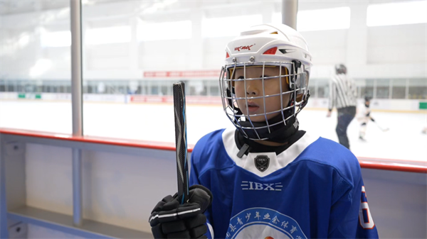 参赛运动员杨雨衡:我学习冰球半年了,感受到这项运动的拼搏、勇敢和不服输的精神,我和小伙伴们会一起加油取得好成绩。