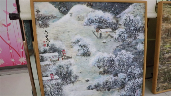 桦南县桦树皮纹理画传承人魏殿贵:《六出飞花》这幅桦树皮画依托树皮纹理,略施淡彩,充分表达了山村春节的美丽景色和东北冬天的民俗氛围。