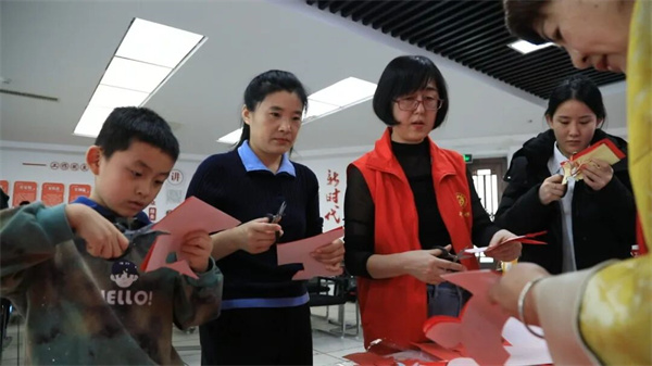 剪纸区域同样热闹非凡。在老师的指导下,孩子们手持彩纸和小剪刀,认真专注地学习折叠、勾画、裁剪。不一会儿,栩栩如生的马形窗花、喜庆对称的“春”字、造型各异的吉祥图案便在孩子们灵巧的小手中诞生。红艳艳的窗花映照着孩子们的笑脸,不仅剪出了浓郁的节日气氛,更剪出了对传统文化的兴趣与传承。与此同时,一旁的“实践厨房”里也是欢声笑语,志愿者们带着孩子们一起动手包饺子,擀皮、填馅、捏合,大家分工协作,忙得不亦乐乎,虽然孩子们包的饺子形状各异,但个个饱含心意,温馨的气氛在房间内久久萦绕。