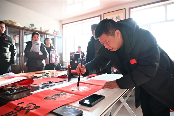 活动现场,县文联组织书法家开展“送福到家”活动,与各级领导一同挥毫泼墨,为村民送上春联与福字,文化传承与物资捐赠相得益彰,既送物质温暖,也传精神年味。