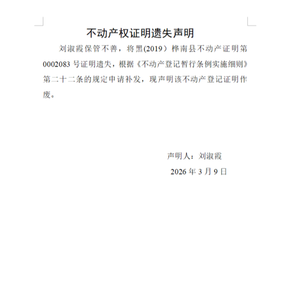 刘淑霞不动产权证明遗失声明