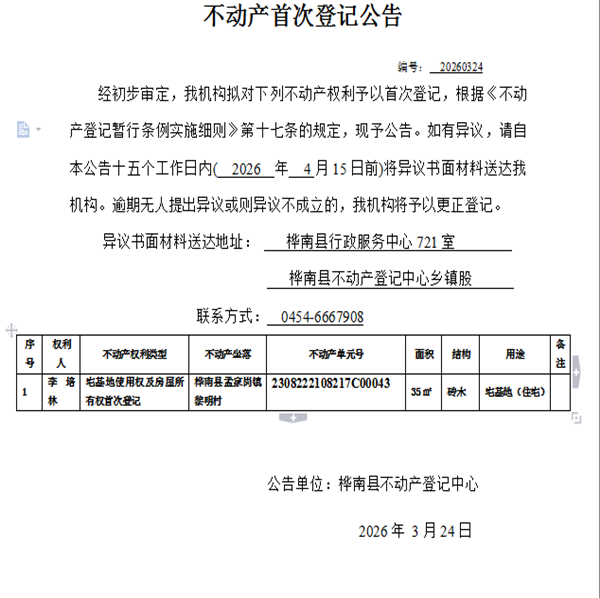 不动产首次登记公告(李培林)
