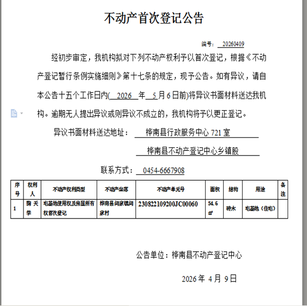 不动产首次登记公告(鞠天学)