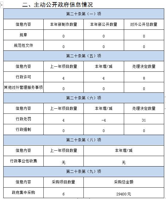 2020年,我局认真按照相关文件要求,在历年政府信息公开工作的基础上,进一步明确工作规范,严格执行《保密法》和政府信息公开保密审查有关规定,坚持“谁公开、谁审查、谁负责,先审查、后公开”的原则,健全审查机制,把好政府信息源头关。通过进一步深化公开、提高实效、完善渠道、夯实基础,全面提升行政透明度,切实保障群众知情权,不断推进我局政务公开工作的发展2020年,我局主动公开信息115条,其中规范性文件0件并公开,制发公开性文件0件,通过政府网站公开信息35条,其他方式公开信息数80条。县卫健局政务公开办设在局办公室,